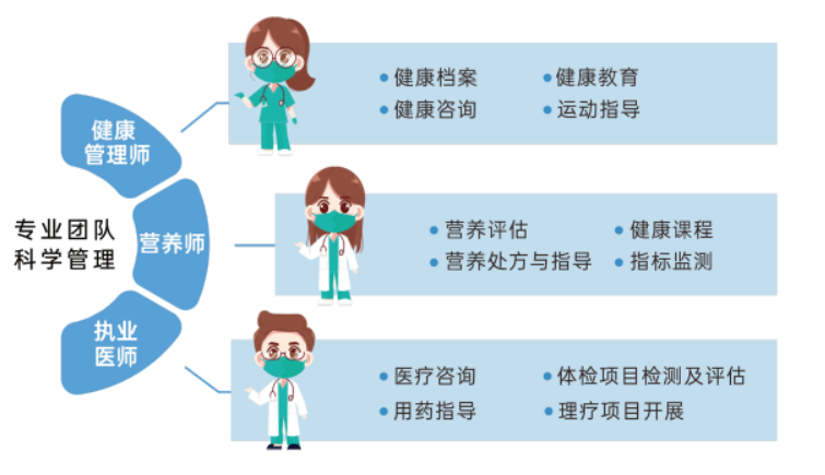 本门诊采用三师共管模式,执业医师团队负责生理医学,营养师团队负责生活医学,健康管理师团队作为医师、营养师团队和患者的助理,具体分工如下图: